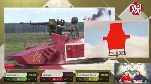 比賽中,中國(guó)隊(duì)駕駛96B坦克從第三賽道出發(fā),與俄羅斯、烏茲別克斯坦車組進(jìn)行首輪比拼。